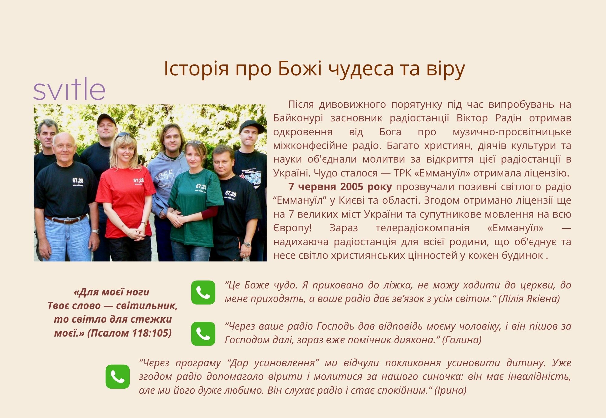 7 червня 2005 р. – початок цілодобового мовлення Світлого радіо «Еммануїл» у м. Києві та Київській області на частоті 67,28 FM! Згодом – запуск on-line трансляції ефірного мовлення на www.svitle.org